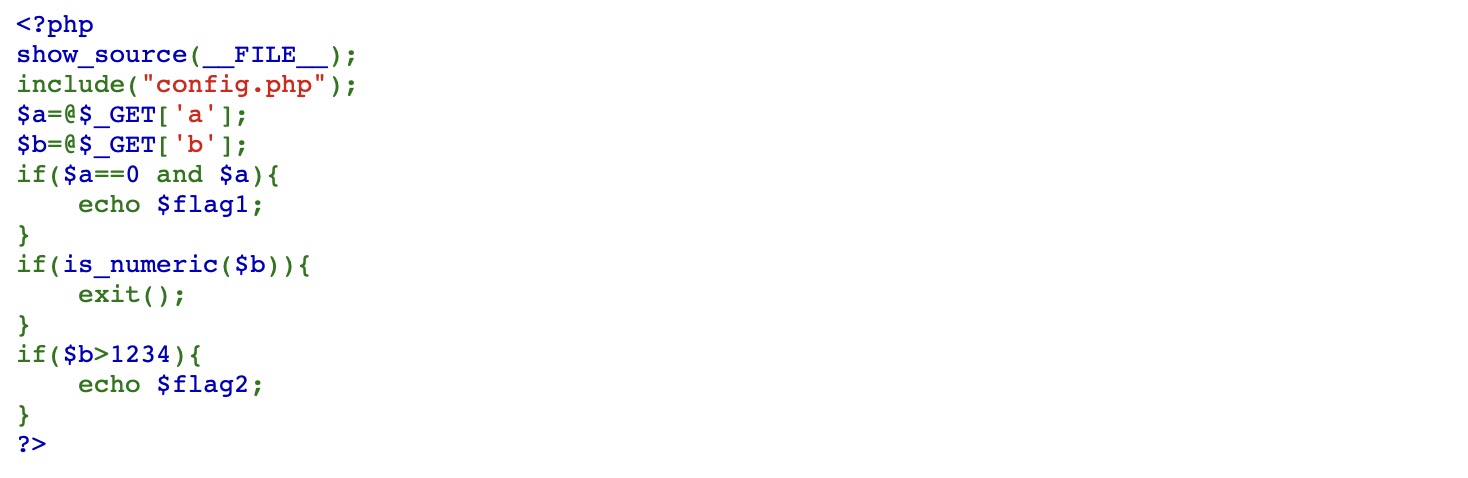 /?a=a=%2530&&b=%34%34%34%34%41 即可获得 flag。