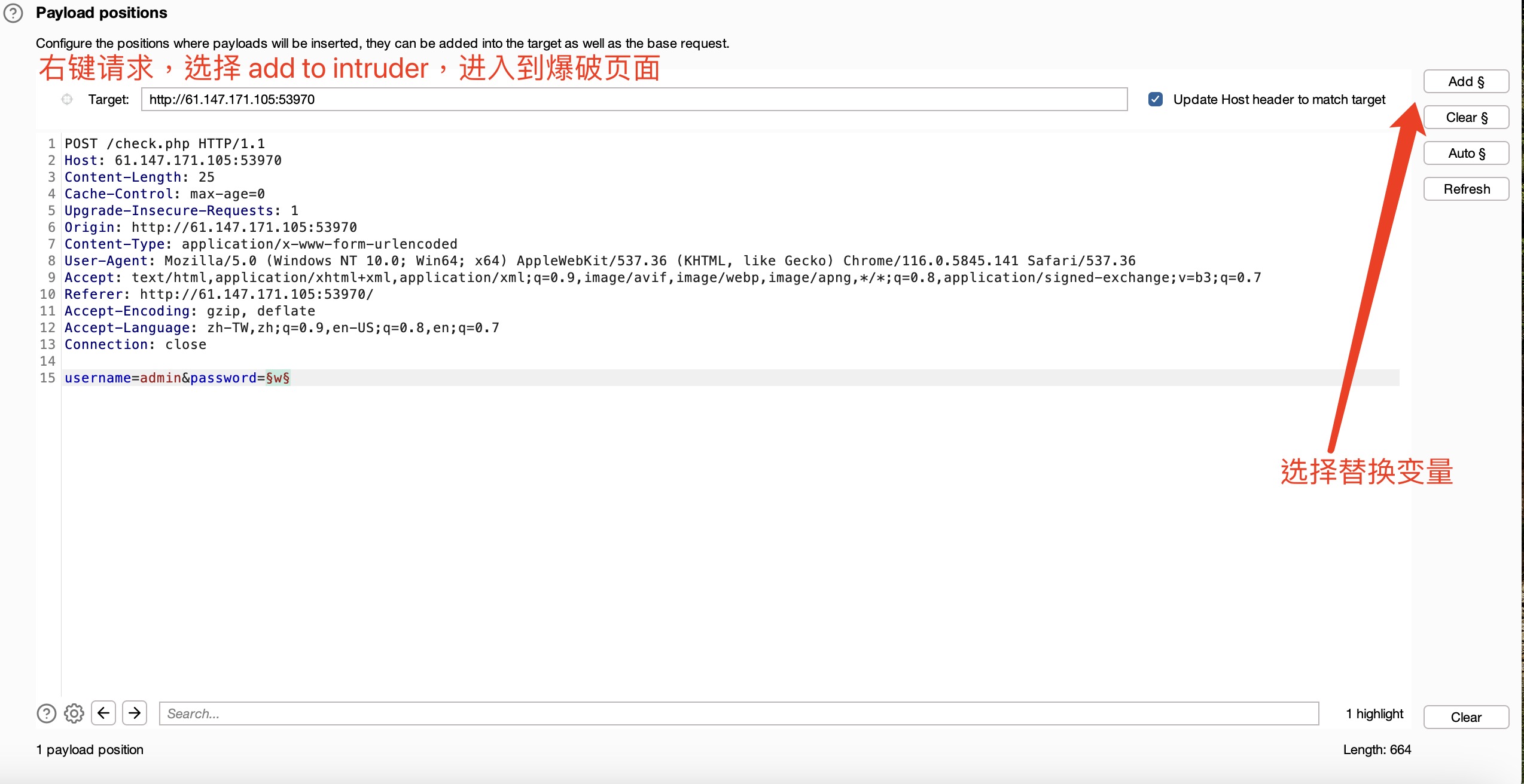 使用 burp 进行爆破,选用爆破字典,更改参数: