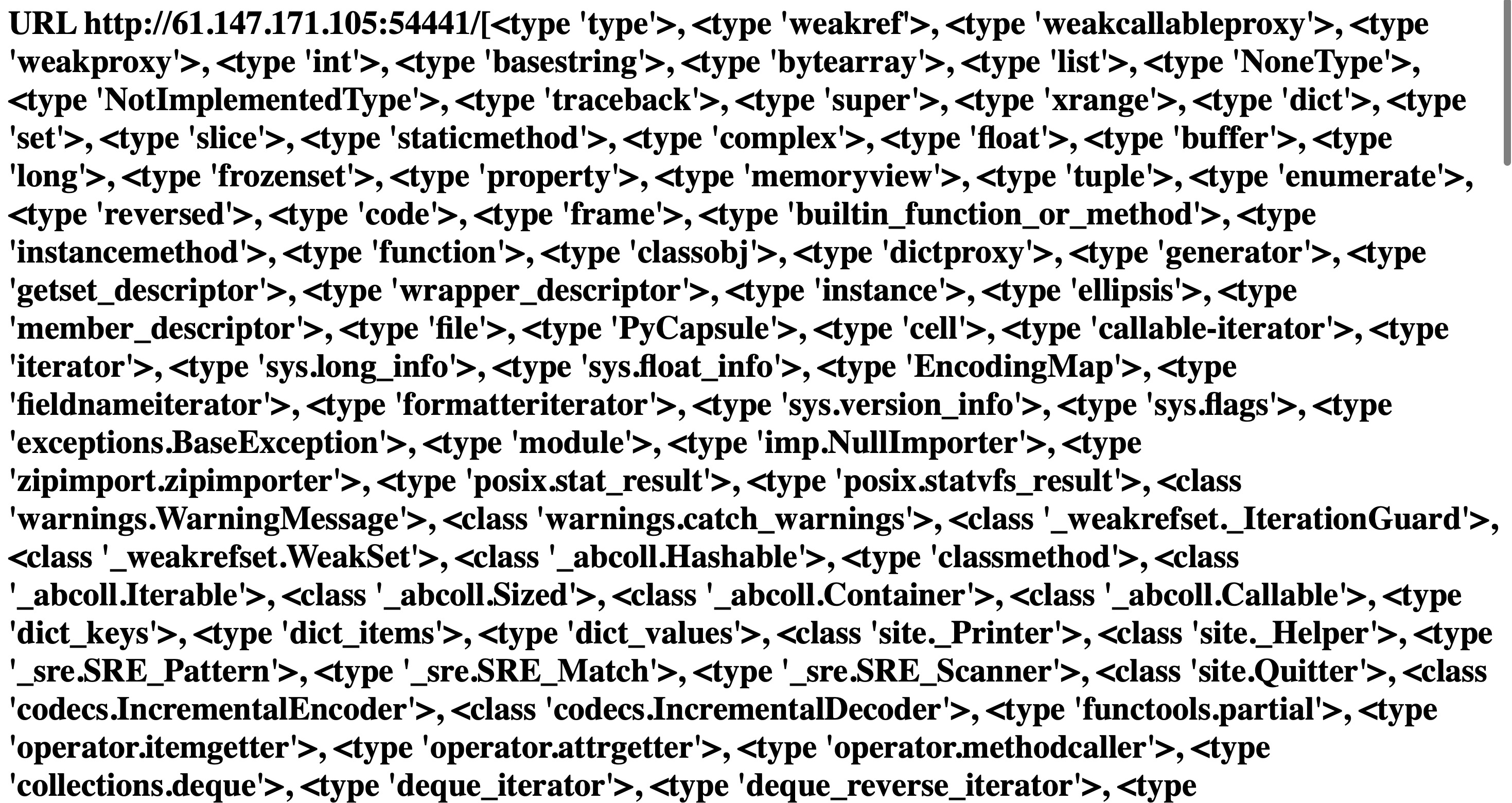 可以看到获取到了两个基类,我们选用 mro[1] 获取其中一个基类,然后再在这个基类里面调取他所有可用的子类,构造 [].__class__.__mro__[1].__subclasses__() 发送,获取到所有子类: