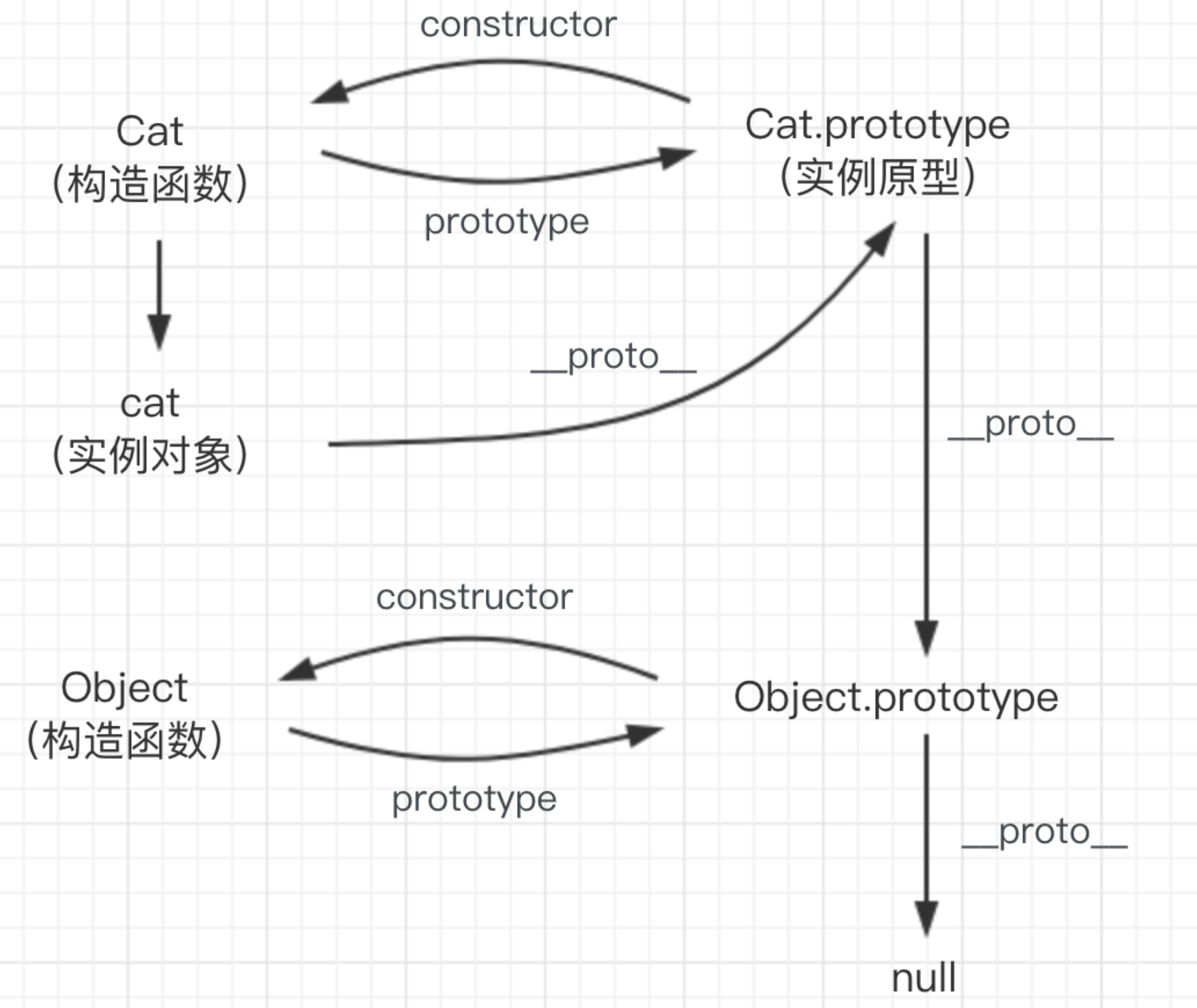 1 | cat(实例对象) -> cat.prototype(实例原型) -> Object['__proto__'] -> null |