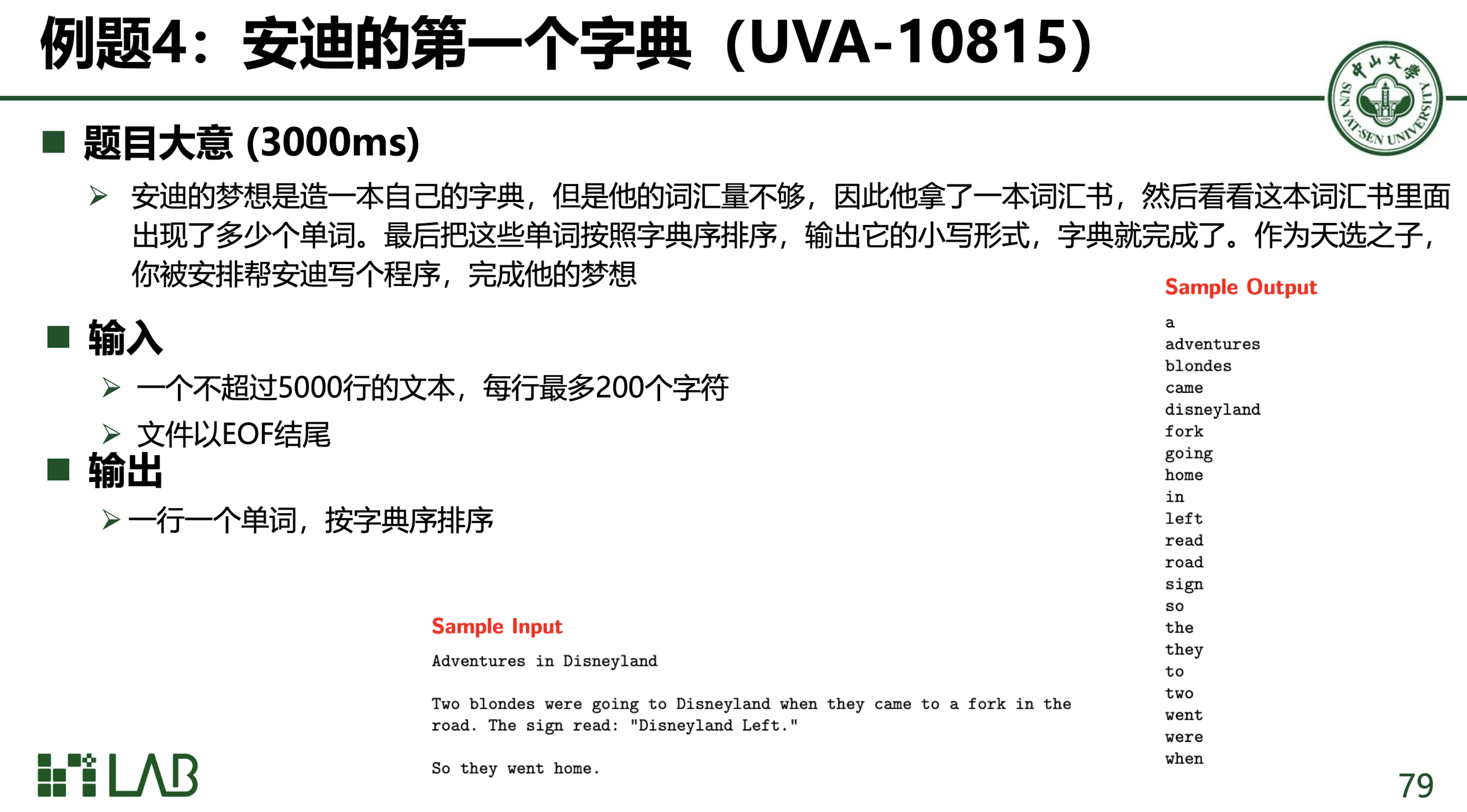 使用 STL 的 set 容器去存储每一个字符串, 然后排序输出即可. 需要注意的是这里使用了 sstream 来读取字符流, sstream 可以将字符流中的字符以空格分开, 然后逐步赋值给其他变量.