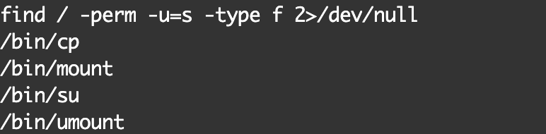 1 | find / -perm -u=s -type f 2>/dev/null |