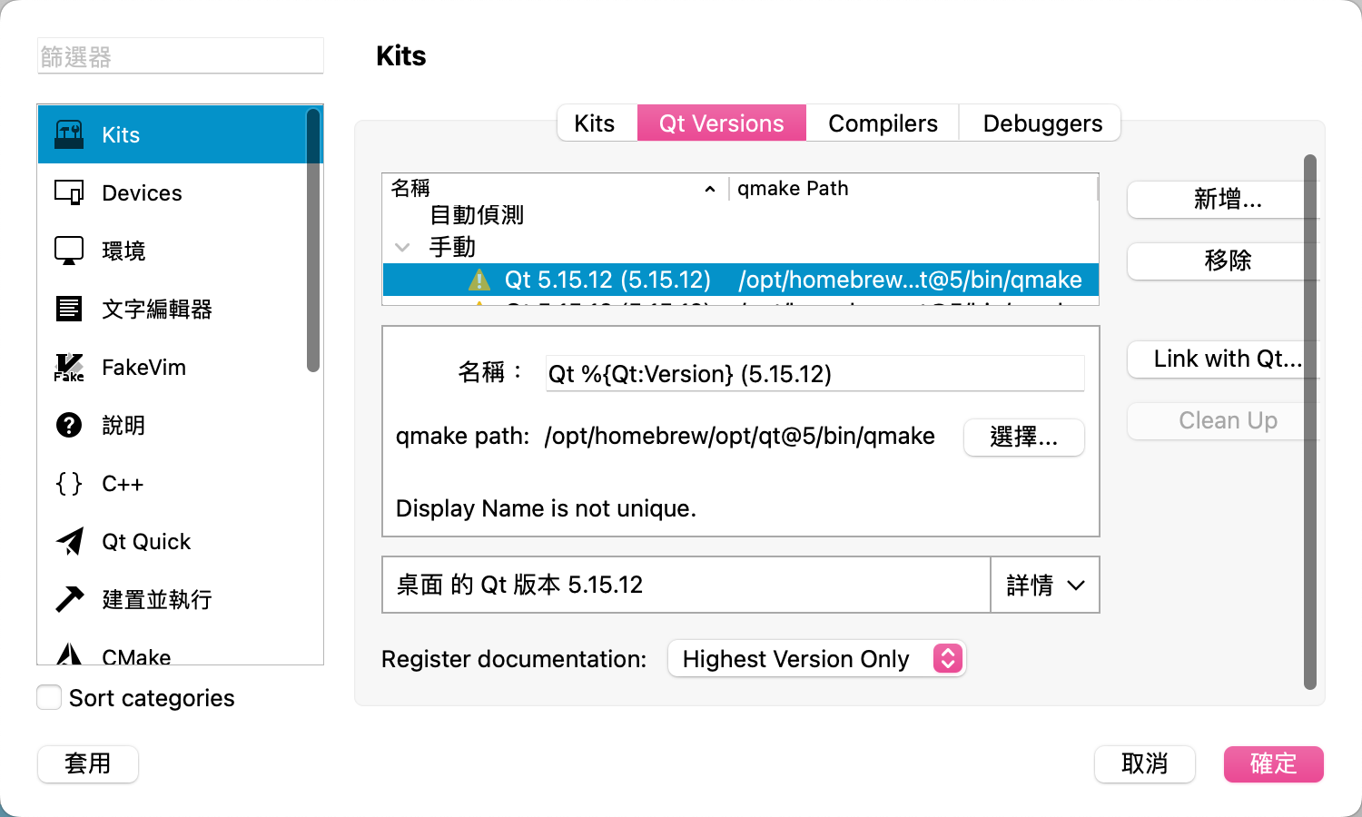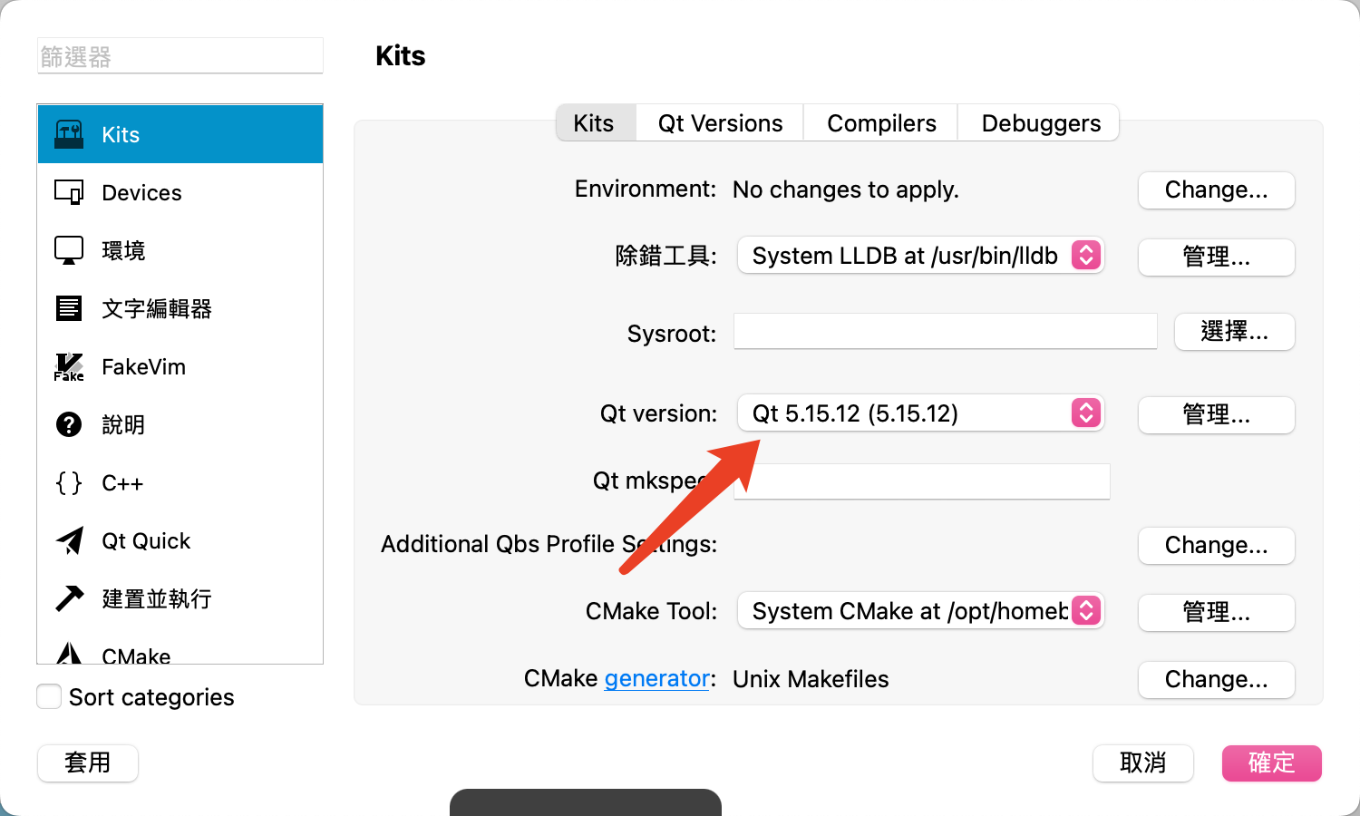 安装好之后打开 qt-creator,然后在 creator 里配置 qt 的环境,qt 的环境要找到刚刚安装好的 qt 目录,然后在里面找到 qmake,可以直接搜索去找,配置好后如下: